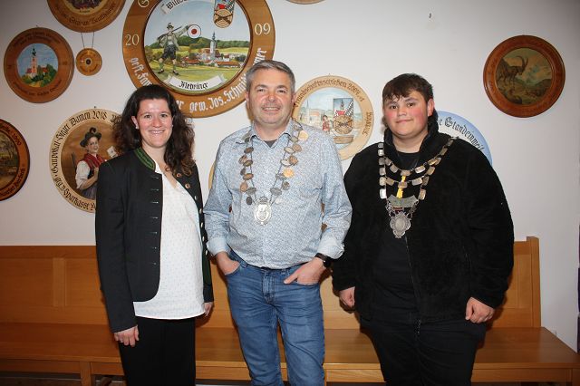 Die neuen Könige der Wildschützen Mehring mit 1. Schützenmeisterin Julia Reitsberger (v.l.n.r.), Luftpistolekönig Werner Longhino und Jungschützenkönig Maximilian Hausner. Die Luftgewehrkönigin Lisa Stadler fehlte aufgrund Besuchs eines Trainingslagers.